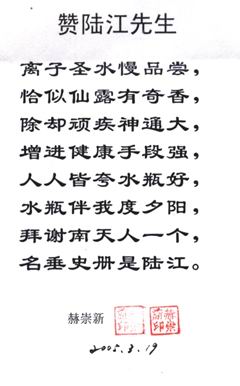 凡尊重中國(guó)古代養(yǎng)生智慧的患者,堅(jiān)持“已饑方食”和定時(shí)主動(dòng)補(bǔ)水者,均可祛病康復(fù)。如牡丹江醫(yī)學(xué)院87歲的張鵬圖飲用半年后高血壓未痊愈,陸江與他通話交流,了解他原先每日主食4兩,建議他用“已饑方食”減少主食肉食量,他理解后,將每日主食減為3兩,少吃兩塊肉,飲用一年治愈26年的冠心病和高血壓。他2003年5月31日來信說:“飲用卓康小分子團(tuán)水是根治高血壓、冠心病、糖尿病的一把金鑰匙,是填補(bǔ)醫(yī)學(xué)空白,為人類造福,應(yīng)推廣該產(chǎn)品。”